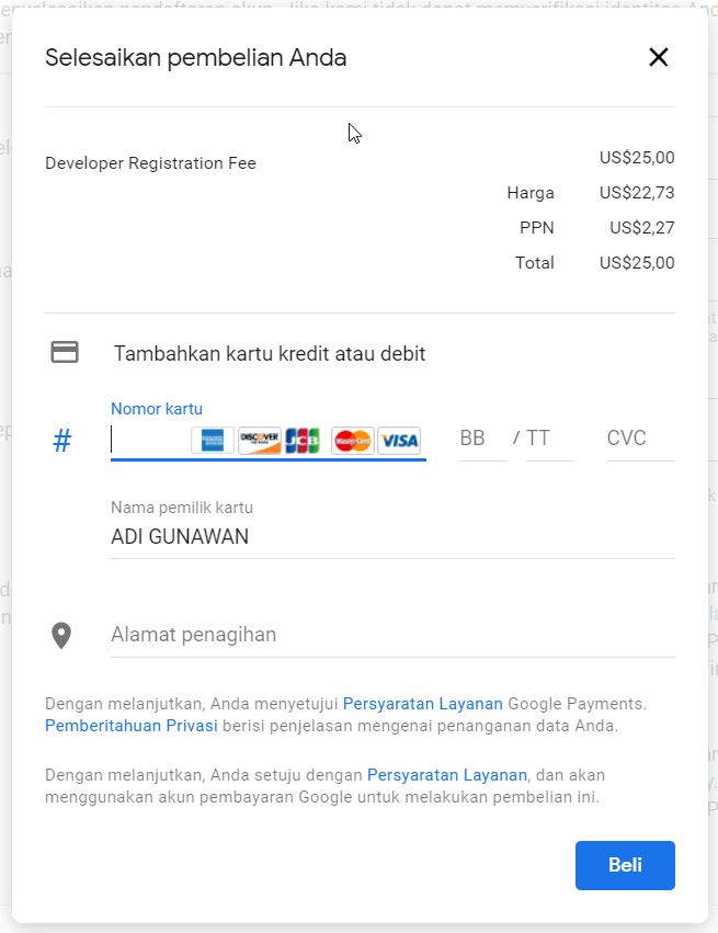 6. Isi nomor kartu, nama pemilik rekening, kode CVV/ CVC, dan alamat penagihan pilih Indonesia.